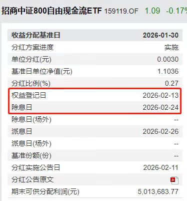 招商基金旗下800现金流ETF(159119)宣布将于近期进行2026年度第一次分红,每份基金份额派发现金红利0.003元。该基金将于2026年2月11日上午开市起停牌,并于10:30起恢复交易,提醒投资者合理安排交易与资金。